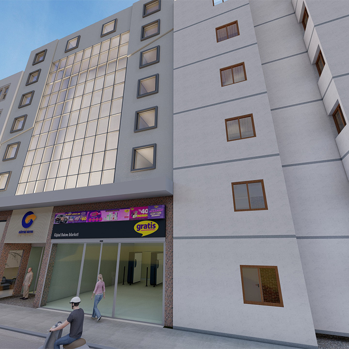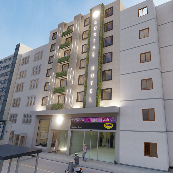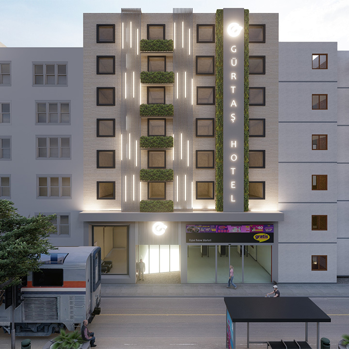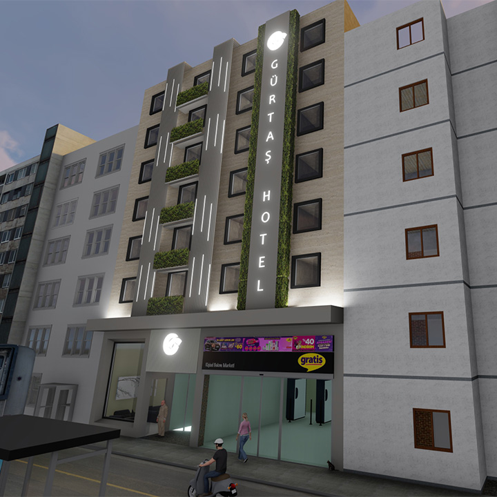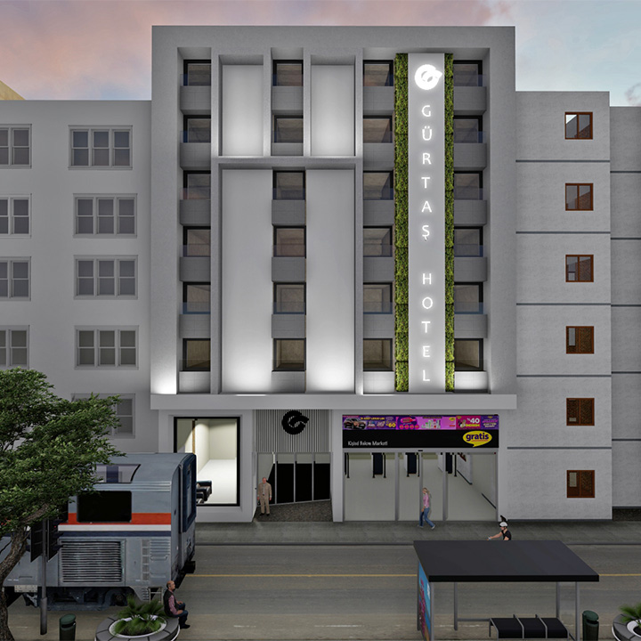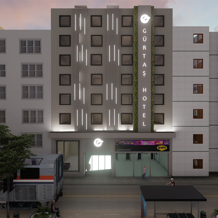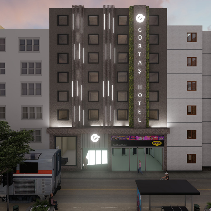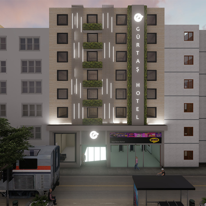 Antalya Muratpaşa'da yer alan Otel ile ilgili dış cephe konsept çalışmamız yapılmıştır. Işıklandırma ve yeşillikle tasarıma bir yön verilmiştir.
